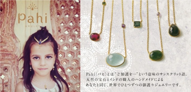 pahiとは“ご加護を…”という意味のインドの古い言葉。世界中の女性の為に生まれたブランドです。インドの色鮮やかな天然石と、現代の女性の心を動かす繊細かつ個性的なデザイン、それを実現するインドの職人の手業がひとつになった作品たちです。