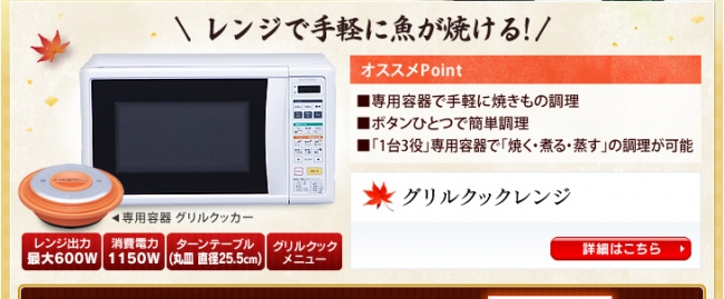 「1台3役」専用容器で「焼く・煮る・蒸す」の調理ができる電子レンジです。専用容器にお魚を入れてボタン一つで手軽に魚をおいしく焼き上げます。[画像11: http://prtimes.jp/i/19942/48/resize/d19942-48-180287-11.jpg ]