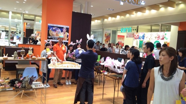イベントスタート。ニコラハウスの看板商品、うさぎシュークリームの内、子供から大人まで大人気の「生クリームカスタード」を一つずお配りし、ニコラシャールと一緒に記念撮影を行いました。