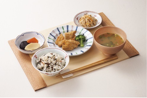 主食の鶏唐揚げに、ひじきご飯・ボイルブロッコリー・切干大根煮・筍煮・椎茸煮・人参煮をセット