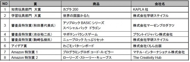 この賞は、Amazonの商品カタログに蓄積された膨大なカスタマーレビューと、専門家(育児・保育専門家:駒崎弘樹氏、教育心理学者:秋田喜代美氏、脳科学者:池谷裕二氏)の意見をもとに、選定されたものです。また、受賞商品だけでなく、海外のAmazonで人気の知育・学習玩具もこの機会に販売を開始し、Amazonならではの品揃えを充実させました。こうした商品群は年齢や用途別に検索できるため、お客様はお子様の発育や教育に役立つおもちゃを、豊富な品揃えの中からより簡単にお選びいただけるようになります。