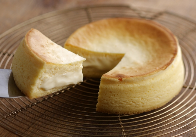 スフレチーズケーキをカットすると、中にはとろりとした口あたりのチーズカスタードクリームが入っています。