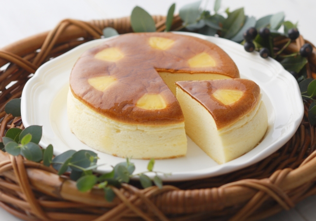 赤い風船ロングセラー、パインののったふわふわスフレチーズケーキ。