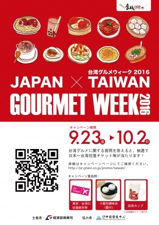 株式会社ぐるなび(本社:東京都千代田区、代表取締役社長:久保征一郎 以下、ぐるなび)は、台湾経済部商業司と一般財団法人中衛発展センター(台湾)と連携し、台湾グルメを食べて、 日本-台湾往復チケットやノベルティが当たるラッキードローに参加できるキャンペーン(http://pr.gnavi.co.jp/promo/taiwan/)を9月23日(金)~10月2日(日)まで開催します。