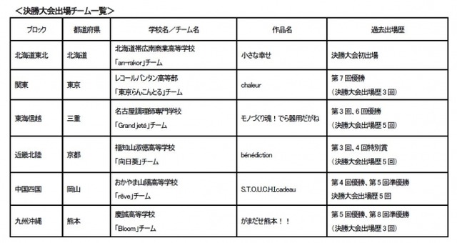 書類審査では、今年の貝印スイーツ甲子園のテーマである「わたしのまちの“新”名物」を表現したテーマ作品を簡単なレシピと作品の写真などで応募。その中から選ばれた各エリアのチームが、筆記試験ならびにテーマ作品1種、課題作品となる“ジェノワーズ(スポンジ)にクリームをサンドしたデコレーションケーキ”を1種、計2作品をキッチンスペースで制限時間内に制作します。各エリアの1位が決勝大会に進出。優勝したチームには世界的に有名なパティシエに会えるパリ研修旅行が贈られます。