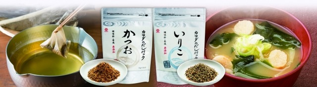 この度、鎌田商事では、 “簡単・便利・本格的”をコンセプトとするご家庭で簡単に本格的なだしが取れる「だしパック」の発売を開始いたします。原料にこだわる鎌田が作った「だしパック」は、天然素材100%、調味料・食塩無添加です。定番の『かつお』はかつお節の名産地、鹿児島県枕崎で丁寧に熟成させた「かつお枯節」を使用し、国産のさば節、昆布、当社オリジナルのさけ節等を合わせることで、ふくよかな香りと旨みがひろがるだしパックに仕上げました。瀬戸内の味『いりこ』は穏やかな瀬戸内の海で獲れたイワシを煮て干した「いりこ」からはコクのあるおだしが取れます。利尻産の昆布を合わせることで、より深い味わいのだしパックに仕上げました。