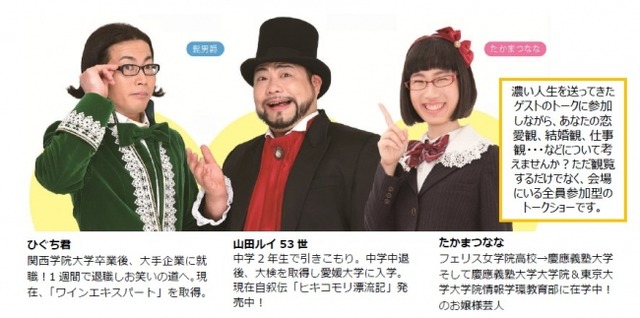 株式会社ベネッセホールディングスの子会社、株式会社ベネッセコーポレーション(本社:岡山市、以下:ベネッセ)の妊娠・出産・育児ブランド「たまひよ」は、出産・子育てがしやすい社会のために何をすべきかをテーマに、2030年に30代になる学生を対象に、広くアイデアを募るコンテスト「Over Million Challenge(オーバーミリオンチャレンジ、以下OMC)」を「ママ tomo パパ tomo」プロジェクトのひとつとして、2015年より実施しています。今回のトークショーはOMC企画の一環として、学生の皆さんに恋愛、結婚、そしてさらに将来の子育てのことに思いを巡らせていただく機会になればと考えています。異色の経歴を持つお笑い芸人の「髭男爵(ひぐち君、山田ルイ53世)」と「たかまつなな」さんの3人に、「恋愛、結婚、就職、仕事、子ども」をテーマに本気で語っていただきます!