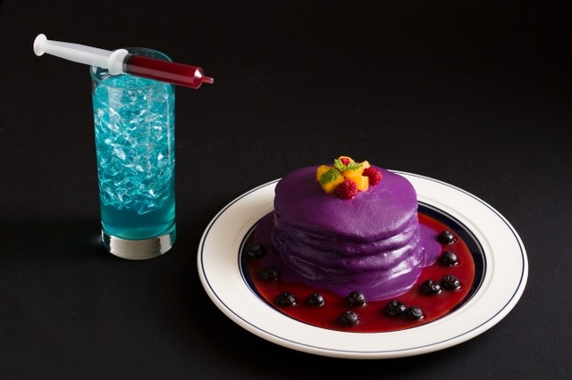 今年はパンケーキだけではなく、真っ赤なストロベリーソースを注射器に入れてグラスに添えたハロウィン限定ドリンクを用意し、より一層ハロウィンを怪しく盛り上げます。パワーアップした限定商品でEggs 'n Thingsならではの特別なハロウィンの雰囲気をお楽しみください。
