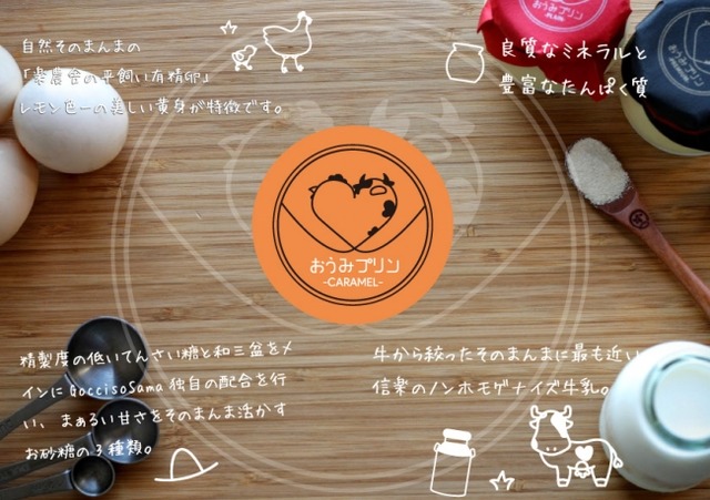 特徴:主原料は全て滋賀県産。卵:平飼い有精卵(高島)・ノンホモ低温殺菌牛乳(信楽)・砂糖:てんさい糖と和三盆をブレンドしたオリジナルシュガー。手作り、無添加。オリジナルシュガ ーを焦がした自家製カラメルソースをプリンの生地に混ぜ合わせ、ほろ苦い中にもコクの有る甘さが広がるプリンです。