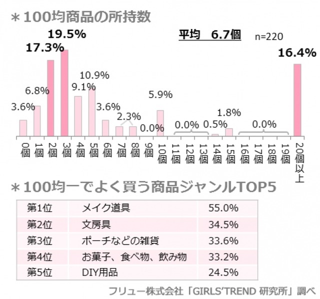 ◆TREND1. 100均商品の所持数は平均6.7個、最も購入しているのは「メイク道具」(55.0%)