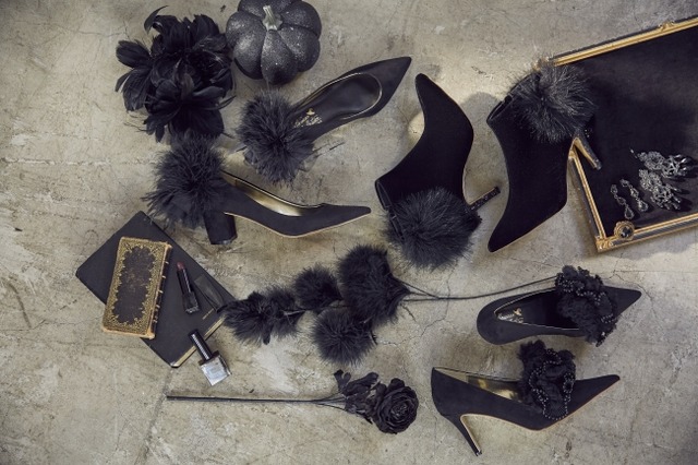 ブラックフェザーにオーガンジーを使用し、魔女ならではの黒々とした印象と女性らしさを兼ね備えた1足。