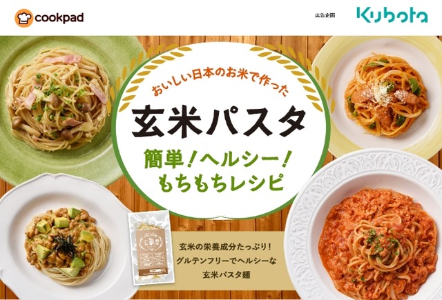 このたび、国内最大のレシピの投稿・検索サービスである「クックパッド」にて、玄米を原料としたパスタ麺の料理レシピをご紹介し、玄米パスタ麺の美味しさをご理解いただく機会を増やすとともに、おいしい日本のコメの消費拡大支援に取り組んでまいります。