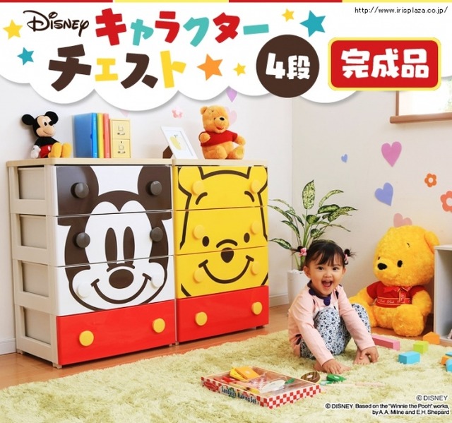 アイリスオーヤマ株式会社(本社:仙台市、代表取締役社長:大山 健太郎)のグループ企業である株式会社アイリスプラザ(宮城県仙台市青葉区中央2丁目1-7 アイリス青葉ビル TEL:0120-323-410)では、大人気のミッキーやプーさんのかわいいフェイスデザインがチェスト全体に描かれている「キャラクターチェスト 4段 ミッキー NHG-W554」と「キャラクターチェスト 4段 プ―さん NHG-W554」を2016年8月31日に新発売しました。熱転写を取り入れ、これまで以上に大きくデザインできるようになった新しいキッズチェストです。大きなフェイスデザインがお部屋を可愛く明るく彩ります。