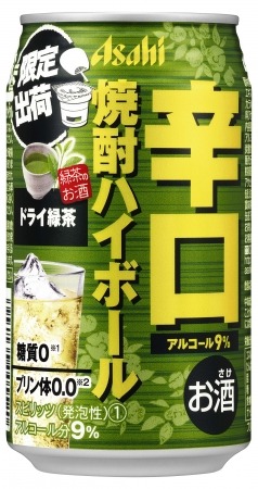 『アサヒ辛口焼酎ハイボール期間限定ドライ緑茶』は、「アルコール度数9%」で「炭酸強め」、「糖質ゼロ(※1)・プリン体ゼロ(※2)」に仕上げた焼酎ベースのハイボールです。ほのかな緑茶の香りと力強い飲みごたえが楽しめます。