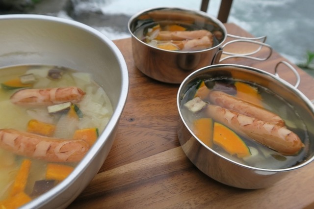 秋の味覚を楽しんで頂ける期間限定メニュー「飯能野菜の収穫祭スープ」をご用意。地元野菜とカボチャが入ったスープを、バーベキューグリルで煮込んでお召し上がりいただきます。また、野菜やウインナー、飯盒炊飯※2のご飯などをスープに加え、お客様オリジナルのアレンジもお楽しみいただけます。