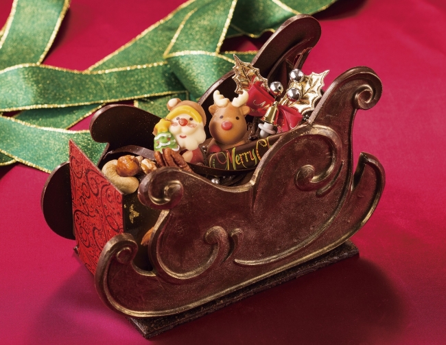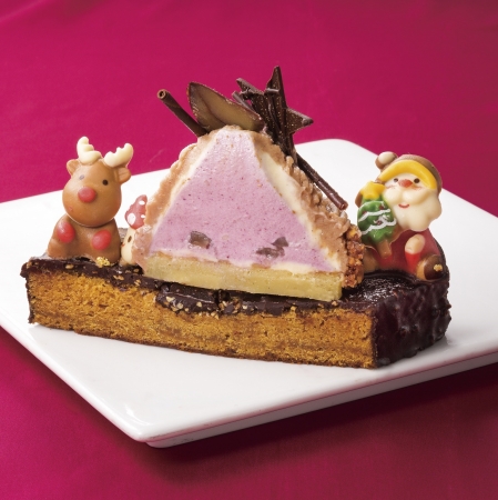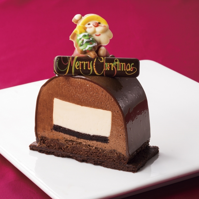 口どけの良いビターチョコレートムースで、香り高いエスプレッソコーヒーのムースを包み込み、カカオ分62%のフランス産チョコレートでサンタクロースの乗るソリに仕上げました。香ばしいプラリネの香りがただよう、チョコ好きにはたまらないクリスマスケーキです。