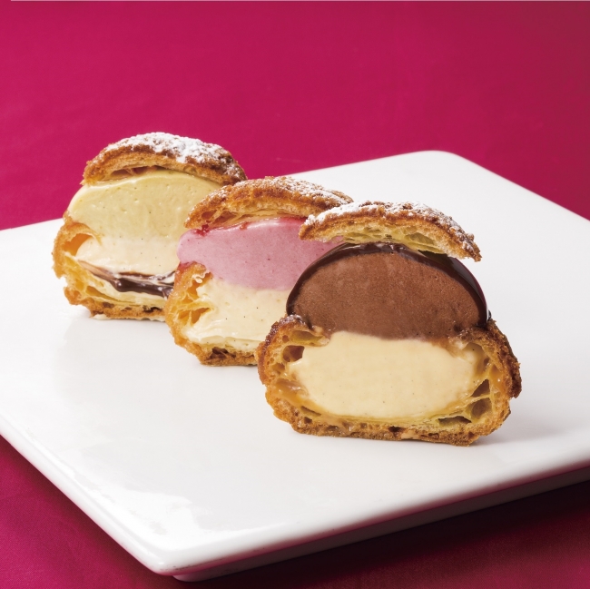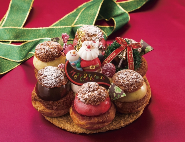可愛らしいシュークリームをあしらい、クリスマスリースに見立てました。香ばしいサクサクのシュー生地にはラズベリー、ピスタチオ、チョコレートの3種類のムースとカスタードクリームがたっぷり。ご友人やご家族とシェアしてお楽しみください。