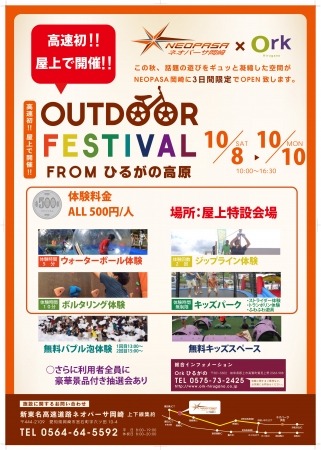 新東名高速道路 NEOPASA岡崎(上下集約)では10月8日(土)~10月10日(月)の3日間、OUTDOOR FESTIVAL fromひるがの高原を開催。