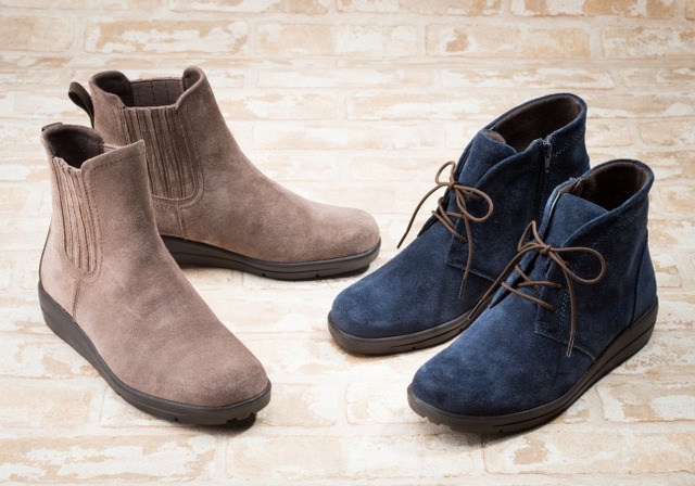 シリーズの特徴である「軽量性」「衝撃吸収」に加え、「防滑ラバー」「洗えるインソール」も付加し、雨が心配なミセスのお出掛けに、本革を活かした温かみある防水ブーツをご提案します。