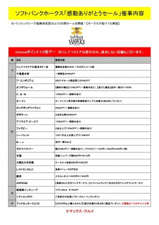 パシフィックリーグ優勝チーム決定翌日より3日間セールを開催! nimocaポイント10倍(一部店舗を除く)のほか、各店にてお得なセールを開催します。 西日本鉄道株式会社が運営する西鉄久留米駅の商業施設エマックス・クルメにて「ソフトバンクホークス 感動ありがとうセール」を開催します。 各店のセール情報は下記内容をご覧ください。 [画像: http://prtimes.jp/i/17692/18/resize/d17692-18-332104-0.jpg ] お得なこの機会にぜひエマックス・クルメにお越しください!プレスリリース提供:PR TIMES