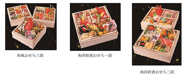 今年は「和風三段」「和洋折衷二段」「和洋折衷一段」「和風一段」「洋風一段」の5種類を販売。日本料理、西洋料理それぞれの料理長が趣向をこらした彩り豊かなおせち料理を新年の始まりにご家族でお楽しみください。