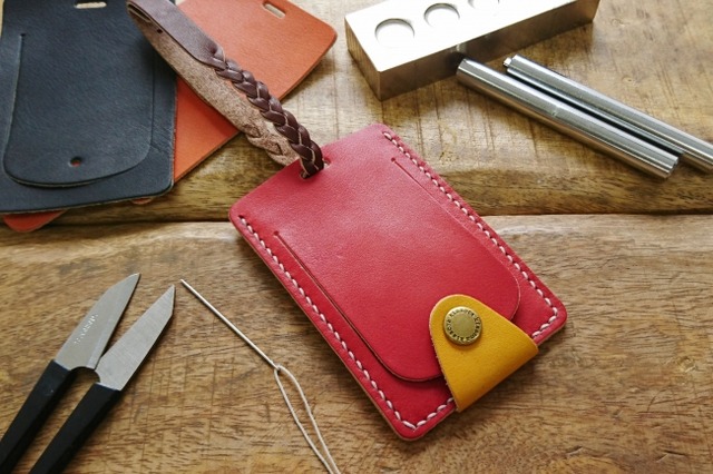 5つのアイテムを組み合わせてオリジナルの「ラゲッジタグ」を作ります。ラゲッジタグの部品となる素材は、植物由来染料「ベジタブルタンニン」で加工された美しいカウレザーを使用しています。ワークショップでは9色のレザーの中から好みの色をセレクトし、名入れを行い、ひと針ずつ縫い合わせていきます。丁寧に思いを込めて作る楽しさを体験しながら、世界にひとつだけの革小物が完成します。
