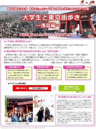 跡見学園女子大学(文京キャンパス:東京都文京区大塚1-5-2/新座キャンパス:埼玉県新座市中野 1-9-6)と株式会社JTBコーポレートセールス(本社:東京千代田区、代表取締役社長:皆見薫、以下JTBコーポレートセールス)は、同大学の学生が企画した東京を訪れた修学旅行生を案内する旅行商品『大学生と東京街歩き~浅草編~』を10月3日(月)より、JTBグループの教育旅行取り扱い支店にて各種教育機関を対象とし販売開始します。