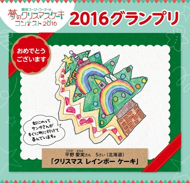グランプリ作品を商品化した「2016 Kid’s Dream Cake」は、2016年12月4日に店頭・ホームページにて発表、同日15:00よりご予約の受付を開始いたします。夢いっぱいのすてきなイラストが、どんなケーキになるのでしょうか?ぜひ楽しみにお待ちください!