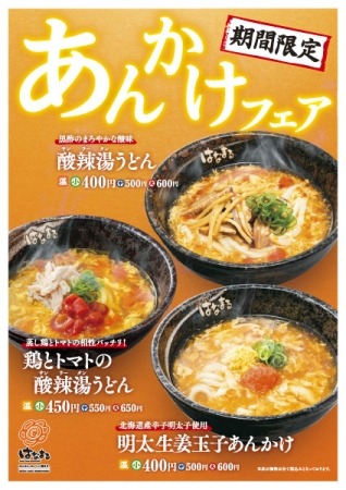 讃岐うどんチェーン「はなまるうどん」を展開する株式会社はなまる(本社:東京都中央区 代表取締役社長:成瀬 哲也、以下はなまる)は、来る9月30日(金)より全国の「はなまるうどん」店舗にて、「あんかけフェア」と題し、期間限定メニュー「酸辣湯うどん」「鶏とトマトの酸辣湯うどん」「明太生姜玉子あんかけ」の販売を開始いたします。