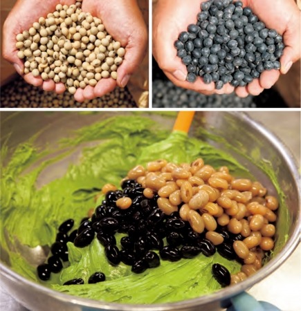 丹波黒豆は古くから丹波地方で栽培され、幕府や宮中に献上された高級品。粒の大きさは世界でもトップクラスで、煮上げるとつやを増します。京白丹波は丹波黒豆と別の品種の黒豆を交配して誕生した大粒の新品種。この2つの大豆は、食感が楽しめるように、つぶさず丁寧に生地に混ぜ込まれています。生地は宇治抹茶を練りこんだ、豊かな香り漂う極上のクリームチーズケーキ生地です。