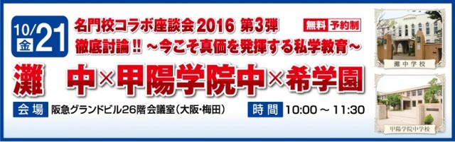 株式会社 希(のぞみ)学園(関西本社:大阪市北区 理事長 前田卓郎・学園長 黒田耕平/以下「希学園」)は、特別企画といたしまして、2014年より実施し、大変ご好評をいただいております「名門校コラボ座談会」の2016年度第3弾《灘 中×甲陽学院中×希学園》を実施いたします。