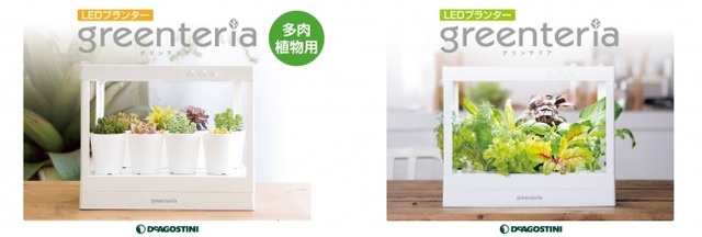 株式会社デアゴスティーニ・ジャパン(本社:東京都中央区、社長:村野 一)は、未来の産業技術として注目を集める「LED植物栽培」を簡単に楽しめる「LEDプランター グリンテリア(greenteria)」を、2016年10月4日(火)より一部地域の書店、インテリアショップや雑貨店及び、当社ホームページにて発売します。本製品は、観葉植物として人気の多肉植物を屋内で簡単に栽培できる「LEDプランター グリンテリア 多肉植物用」と、自宅で気軽に水耕栽培を楽しめる「LEDプランター グリンテリア 野菜用」の2種類を発売します。「LEDプランター グリンテリア(greenteria)」シリーズは、緑が映えるシンプルなデザインで、様々なお部屋のインテリアとも相性の良いデザインとなっています。