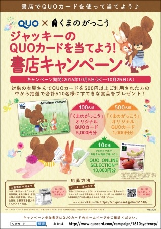 本キャンペーンは、2017年に15周年を迎える人気絵本シリーズ「くまのがっこう」の「祝!くまのがっこう15周年ジャッキー応援プロジェクト」の参加企画のひとつとして、未就学児とその親をはじめとした幅広い世代のお客様に「QUOカードが書店でも使える」ことをさらにアピールするとともに、お客様への日頃のご愛顧への感謝の気持ちを込めて実施いたします。