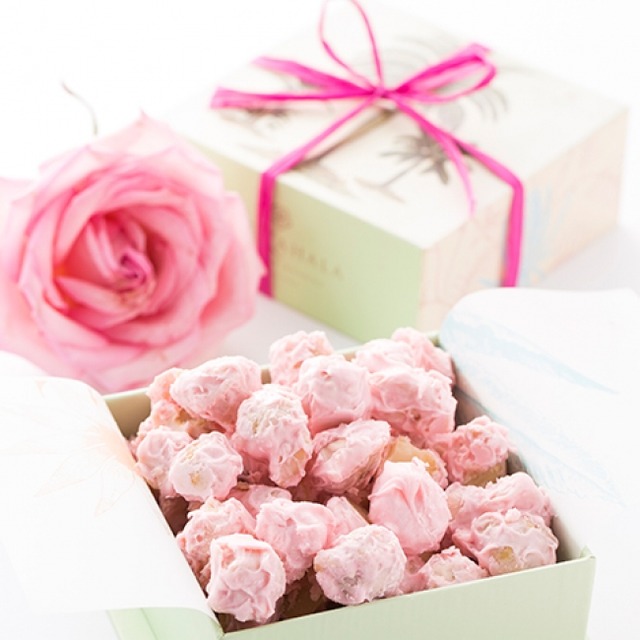 多くの地元の方や、観光でお越しのお客様にお土産や贈り物として大好評をいただいているザ・カハラのマカダミアナッツチョコレートは、1964年のホテル開業当初から1番人気のお土産として愛され続けています。ハワイ島産の大粒の最高級ナッツをじっくり香ばしくシュガーローストし、フランス産の最高級チョコレート、ヴァローナチョコレートでコーティングされたナッツはシェフの手で毎日丁寧に手作りされており、年間30,000パウンド以上の量が作られます。定番の4つのフレーバー(ダーク、ミルク、ホワイト、ブロンド)に加え、10月限定にてピンク・チョコレートマカダミアナッツが登場します。