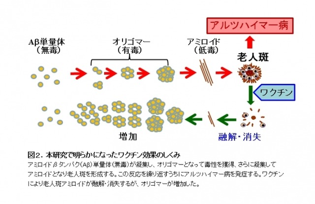 以上の結果から、ワクチンにより老人斑アミロイドが融解することで、老人斑は消失しましたが、その反面で毒性のあるオリゴマーが増加したものと考えられます(図2)。これが、これまでのワクチン療法、抗体療法の治験がうまくいかなかった理由と考えられました。