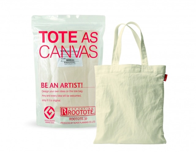 多くの人に、絵を描く楽しさや表現する楽しさ、また、それが鑑賞される楽しさを感じてもらいたいという思い、そしてそのトートバッグを持った人々が行き交う街はギャラリーのようになって楽しいのではというコンセプトから2003年10月に生まれたROOTOTE(ルートート)の無地の白いトートバッグです。「トート・アズ・キャンバス」は商品のみならず、コミュニケーションデザインとして評価され、2004年度グッドデザイン賞(商品デザイン部門/身のまわり商品)を受賞しています。