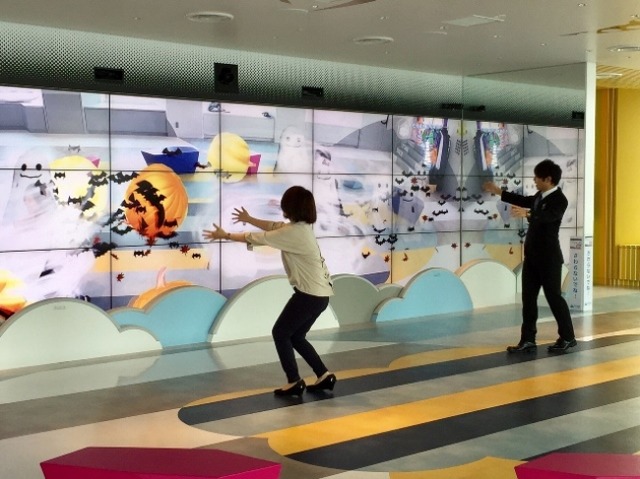 インタラクティブ3D ARシステムを使用し、人の動きや位置をセンサーが感知して、画面の中で雲や雷など天気を操ることができるコンテンツ「SKY PARTY」では、ハロウィン限定バーションの映像コンテンツをご用意しました。友人や恋人、家族と、映し出されるオバケやカボチャで遊んじゃいましょう!