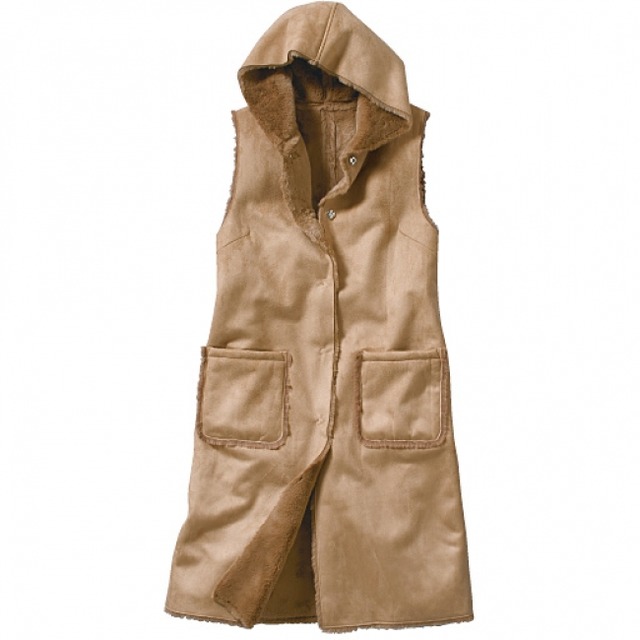 なめらかで上質感のあるフェイクムートンのフード付きジレ。内側はフェイクファーで着心地も快適な一枚。ロングジレはI ラインに見せる効果もあり、秋から冬まで長く活躍します。