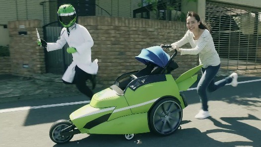 主人公はベビーカーを押すお母さんと赤ちゃん。泣き顔の赤ちゃんに困り果てた様子のお母さんがベビーカーを押して歩いていると、突如グリーンのヘルメットを被った集団が現れ、ベビーカーを瞬く間に改造します。彼らの名は「松戸市子育てサポートクルー」。気づかぬうちにピットインしていたお母さんと赤ちゃんは、見違えるほど進化したベビーカーと共にトップスピードで走りだし、笑顔で松戸の街を駆け抜けます。併走する医師や、ロリポップマンの男性が子育て支援の充実を伝え、最後は保育園にゴール!大きく振られたゴールフラッグやクルーたちと一緒に大喜びのお母さんと赤ちゃんが映しだされます。