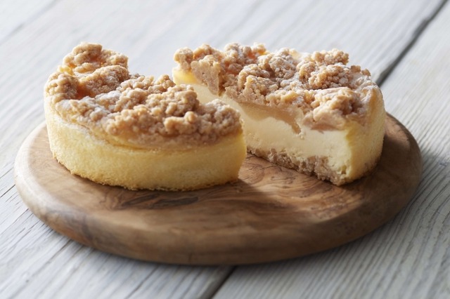ルタオらしい発想で、リンゴの新しいスイーツを作りたい。そんな想いから生まれた自信作です。ベイクドチーズケーキには道産クリームチーズに国産サワークリームを加え、全体の甘さとバランスをとりつつ、味にキレを出しました。ほんのりシナモンが香るシュトロイゼル(粒状の生地)を仕上げに振りかけ、アクセントにしています。