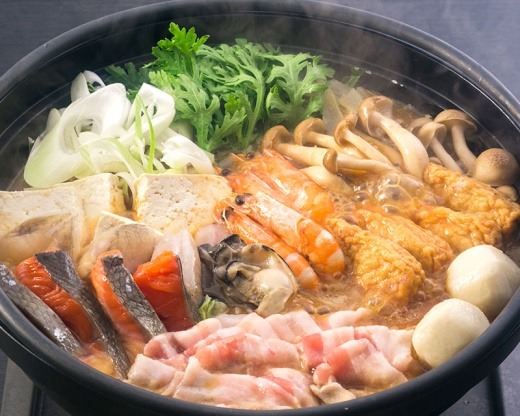 里芋や茸などの山の幸と、海老や牡蠣などの海の幸とをふんだんに使い、ちゃんこ風に仕上げました。