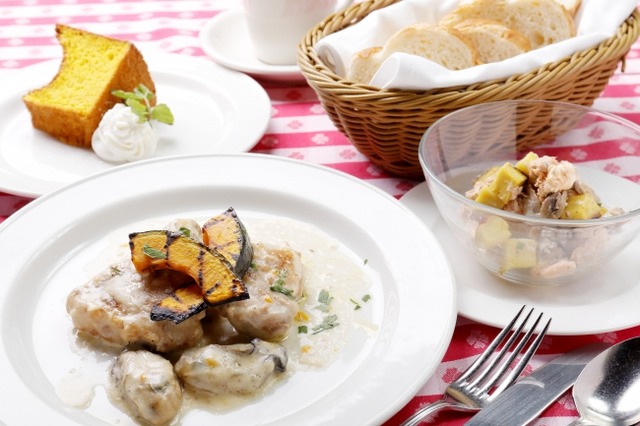 秋鮭とサツマイモ・キノコのサラダ / チキンと牡蠣のクリーム煮 / カボチャのシフォンケーキ /
