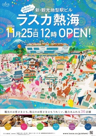 湘南ステーションビル株式会社(本社:神奈川県平塚市/代表取締役社長:栗田 勝)は、熱海駅の新たなランドマークになる新・観光地型の駅ビル『ラスカ熱海』が、2016年11月25日(金)12時にグランドオープンすることをお知らせします。なお当日は、静岡県 土屋副知事や熱海市 齊藤市長らをお迎えし、11時20分(予定)より施設前スペースにて、オープニングセレモニーを実施致します。その他開業を記念した様々なイベントを、11月25日(金)~12月31日(土)の期間に展開するだけでなく、「ラスカ熱海」限定商品も多数登場します。