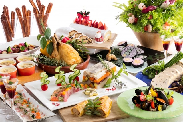 低温でじっくり火を入れた後、皮をパリっと香ばしく焼き上げたローストチキンは、甘酸っぱいクランベリーソースを添えて。サーモンとまぐろのテリーヌは、寒い冬に身体を温めてくれる根菜のコンフィと共にご賞味ください。旨みが凝縮された「自家製パテドカンパーニュ 苺のガストリック添え」はそのままでも、サラダに添えても、パンに挟んでもおいしくお召し上がりいただる一品です。そのほか、赤ワインでじっくり煮詰めたキャベツに鴨挽肉を合わせてパイで包み焼き上げる「赤ワイン風味のダックパイ」や、見ているだけでワクワクする「クリスマス巻き寿司」なども並びます。デザートにはふわふわのスポンジと甘酸っぱい苺との相性が抜群の「苺のユールログ」や、ドライフルーツやナッツがたっぷり入ったホテルメイドの「シュトーレン」などが並びます。