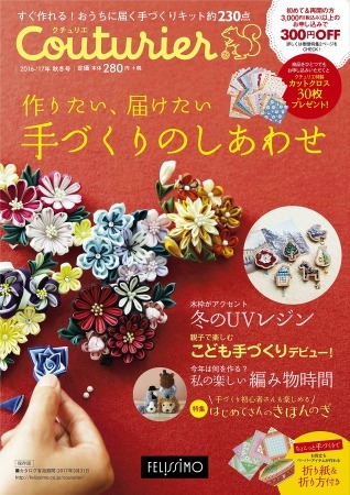 フェリシモの手づくり雑貨ブランド『Couturier [クチュリエ]』は、『Couturier[クチュリエ] 2016年-'17年秋冬号』を10月15日(土)より、全国書店・コンビニで発売いたします。A4判142ページで、価格は税込302円。すぐに作れる!おうちに届く手づくりキット約230点を掲載した、この秋冬におすすめしたい旬な手づくりがチェックできる手づくりの総合カタログです。手づくりをはじめたい方、すでにハマっている方必見の一冊。このカタログから手づくり商品をお申込みいただくと、プレゼントや割引などの特典もあります。