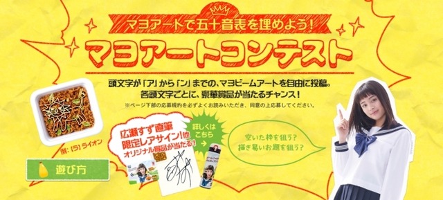 内容:イラストの頭文字が「ア」~「ン」(五十音)までのマヨビームアートをTwitterへ投稿して頂き、各文字ごとに優秀作品を選出。優秀作品には豪華賞品を贈呈いたします。
