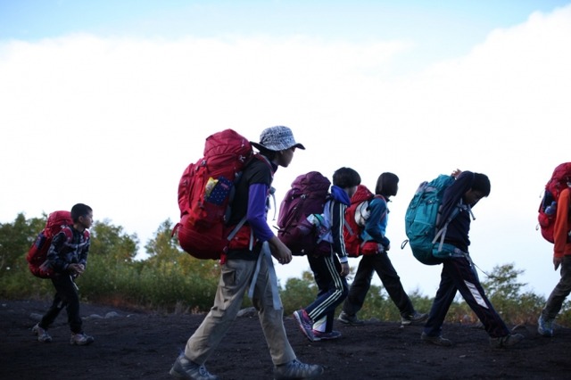 スタッフの指導のもと、40Lのザックにキャンプ装備を自分で詰めるところからスタート。それを背負って初日の目的地である佐藤小屋をめざし歩きます。到着後はみんなで協力してテントを張り、夕食までの時間は鬼ごっこやリレー大会を楽しみました。疲れなんて言葉は子ども達にはありません!夜は南風のため、この時期とは思えないほどの暖かい風。テントから出て、満天の星を眺めながら地面に寝た子どもたちもちらほら。明け方の御来光共々、山での一泊は本当にすばらしい体験となりました。翌日は、五合目から小さなリュックに代えて、三合目へ向けて森の世界を下りながらのトレック。苔むした緑の世界は魅力いっぱいで、歩きやすい道を軽やかに辿りました。