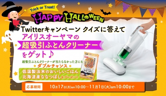 アイリスオーヤマ株式会社(本社:仙台市、代表取締役社長:大山 健太郎)のグループ企業である株式会社アイリスプラザ(宮城県仙台市青葉区中央2丁目1-7 アイリス青葉ビル TEL:0120-323-410)では、「ハッピーハロウィン★クイズに答えてアイリスオーヤマの超吸引ふとんクリーナーをゲット♪」キャンペーンを2016年10月17日(月)10:00AM~2016年11月1日(火)10:00AMまで開催中です。アイリスプラザ公式Twitterアカウント「@irisplaza」をフォローして、クイズの答えをツイートすると、抽選で1名様に大人気「超吸引ふとんクリーナー」をプレゼントします。さらに、「超吸引ふとんクリーナー」が当たらなかった方にもダブルチャンス!抽選で50名様に「低温製法米のおいしいごはん 北海道産ななつぼし 180g 3パック」をプレゼントします。