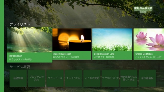 「寝たまんまヨガ 簡単瞑想」は、Android TVでご利用いただくことで、ご自宅のテレビに映しながらアプリケーションを楽しめるようになります。また、大画面に対応するため新たに各コンテンツに合わせて厳選したイメージ画像が、ユーザーをさらに深いリラクゼーションの世界に誘います。