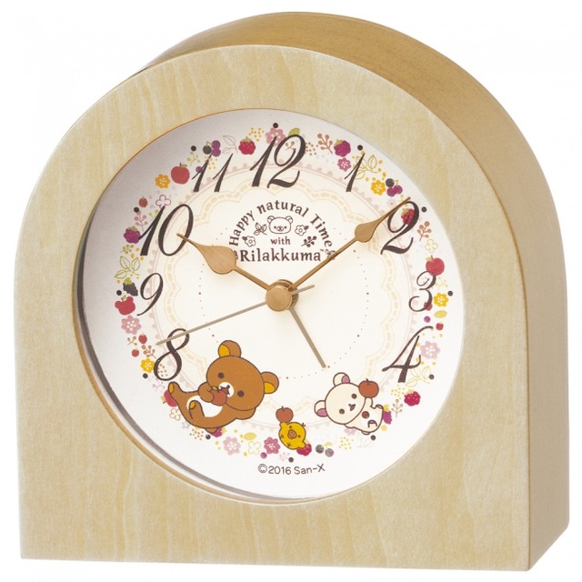 リラックマたちのくつろぐ姿とメープルの美しい木目柄でやさしい風合いを出しました。ゴールドカラーの針がアクセントになっています。